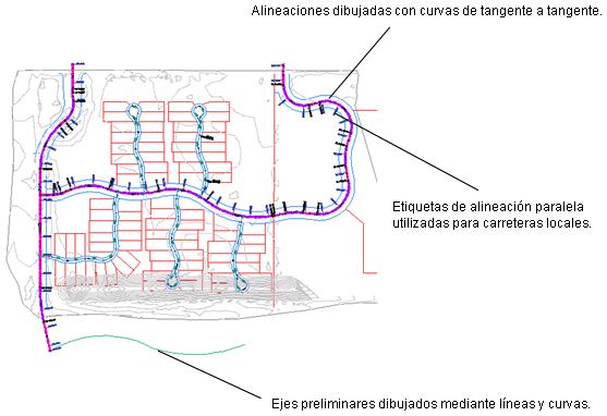 Los objetos de alineación pueden representar ejes de la carretera, redes de tuberías y otras líneas bases de la construcción. La creación y definición de una alineación horizontal es uno de los primeros pasos del diseño de carreteras, ferrocarriles o emplazamientos. Puede dibujar la geometría de alineación como una polilínea y crear la alineación guardada a partir de esa geometría. Para disponer de un mayor control, puede crear un objeto de alineación usando las Herramientas de composición de alineación. También se pueden realizar ediciones en las alineaciones utilizando pinzamientos o los comandos de la barra de Herramientas de composición de alineación, mientras se mantiene automáticamente la tangencia entre los componentes de alineación.