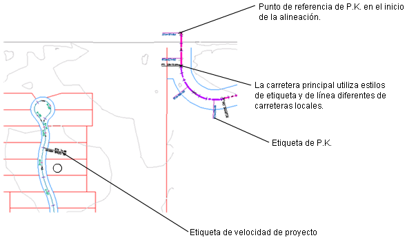 El aspecto visual de los componentes de alineación y etiquetas se controla a través de los estilos. Se pueden crear estilos específicos para utilizarlos en las distintas fases de un proyecto. Cuando se crea una alineación, se especifica un estilo para el objeto de alineación y estilos para las etiquetas de alineación. En el cuadro de diálogo Etiquetas de alineación se pueden crear grupos de estilos para etiquetas de alineación y guardar estas etiquetas como un conjunto de etiquetas para utilizarlas en otras alineaciones.