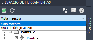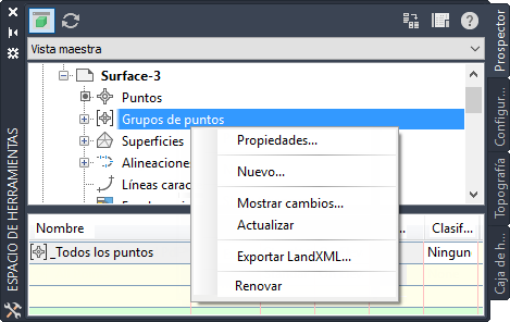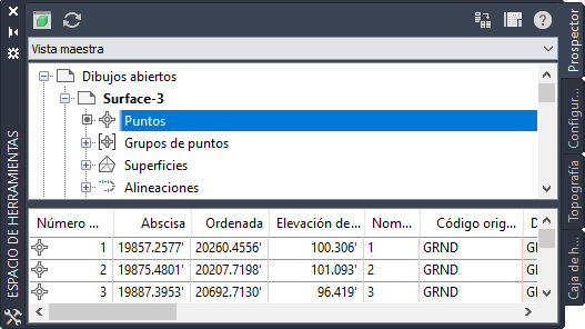 La ventana Espacio de herramientas es un componente integral de la interfaz de usuario que permite acceder a comandos, estilos y datos. Utilícela para acceder a las fichas Prospector, Configuración, Topografía y Caja de herramientas. Haga clic con el botón derecho en cada colección o elemento de estas fichas para acceder a comandos.