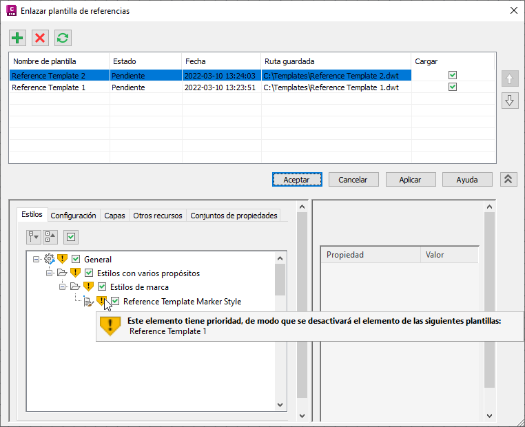 Cuando enlaza una plantilla de referencias adicional a un dibujo, se añade a la parte superior de la lista de plantillas según la prioridad más alta de la plantilla y recibe una notificación si los componentes son duplicados de componentes en otra plantilla de referencias. Para obtener más información sobre la administración de duplicados, consulte