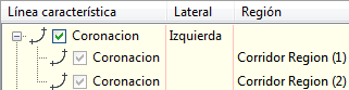 Si ha seleccionado una línea característica de un conjunto de segmentos de línea característica que tienen el mismo código, al seleccionar Unir líneas características en regiones adyacentes se seleccionan automáticamente todas las demás líneas características de ese conjunto tanto de regiones contiguas como no contiguas; asimismo, las casillas de verificación de determinados segmentos de línea característica aparecen atenuados.