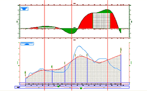Para crear un diagrama de masas es necesario contar con una lista de materiales del dibujo. Un diagrama de masas (superior) se puede asignar directamente a una visualización del perfil (inferior) creada a partir de la misma alineación.