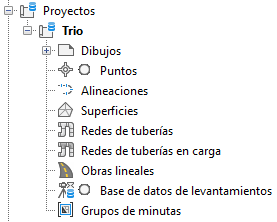 Un proyecto contiene colecciones de objetos de proyecto, por ejemplo superficies, alineaciones, perfiles, redes de tuberías, redes de tuberías en carga y grupos de minutas, que se pueden compartir con otros. Todos los objetos de proyecto compartidos se muestran en las colecciones de objeto de proyecto del árbol del Prospector. Los miembros del proyecto pueden crear una copia de sólo lectura de un objeto de proyecto, denominada referencia, en un dibujo. Esta copia de sólo lectura de la geometría del objeto de proyecto se puede utilizar para realizar tareas de etiquetado, diseño, análisis o análisis condicional.