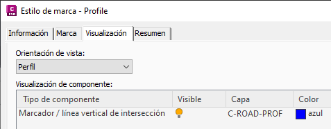 El componente Marca/Línea vertical de cruce controla la visualización de la marca (que se utiliza para visualizar perfiles de cruce, líneas características, representaciones topográficas y polilíneas 3D) y las líneas verticales de cruce (lo que se utiliza para la visualización de cruces de alineación).