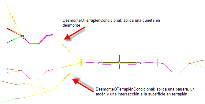 En la ilustración siguiente se muestra un ejemplo de un ensamblaje que contiene un subensamblaje DesmonteOTerraplénCondicional configurado para que aplique una cuneta en situaciones de desmonte; y otro subensamblaje DesmonteOTerraplénCondicional configurado para que se aplique una barrera, un arcén y una intersección en la superficie en situaciones de terraplén.