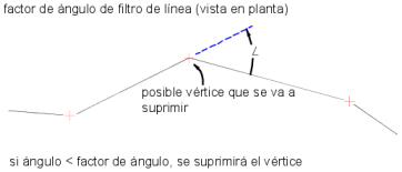 Reduce el número de vértices que se generan en la entidad de ajuste óptimo. El factor de filtro de línea omite los vértices con una curvatura menor que la Tolerancia de ángulo. Un ángulo de curvatura mayor simplifica un mayor número de puntos. La Tolerancia de ángulo se mide en unidades angulares. La Tolerancia de ángulo debe ser menor que la Distancia de suplementación.
