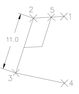 El ejemplo siguiente ilustra el uso del comando Línea por orientación y distancia para dibujar una línea desde punto 5, paralela a la línea 2-3, con una distancia equivalente a 2-1, y después una línea de cierre paralela a 1-2 y que se cierra en la línea 2-3.