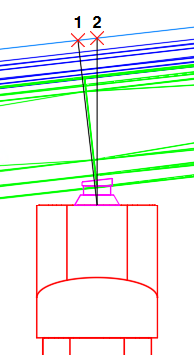 Sin embargo, en las etiquetas de visualización del perfil de Civil 3D, el P.K. se calcula recto hacia arriba (se muestra como la ubicación 2 en la ilustración anterior) y puede no ser perpendicular al perfil de la carretera donde hay un talud en el modelo de InfraWorks. Si añade una etiqueta de visualización del perfil en la misma ubicación que la etiqueta del pilar, el valor de la ubicación 2 se utilizará como valor de P.K. en una etiqueta de visualización del perfil y no coincidirá con el P.K. de la etiqueta de proyección del puente.