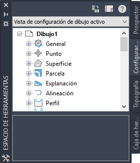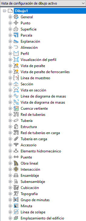 El árbol de Configuración permite administrar los estilos de objeto, etiqueta y tabla, así como controlar la configuración de dibujos y comandos.