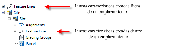 Las líneas características pueden existir dentro o fuera de un emplazamiento.