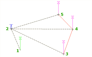 Tras definir la línea de referencia, precise un ángulo y una distancia a los puntos que definirán el segmento de línea. A partir de la línea de referencia (1-2) y el punto inicial (2), precise puntos (3, 4, 5).