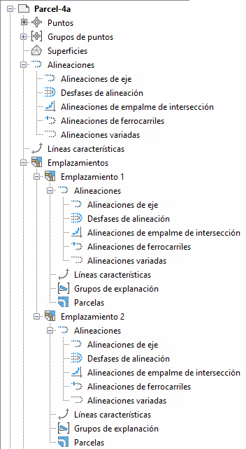 - La colección Alineacionesdentro de una colección de topología o emplazamiento. Cuando se colocan aquí, las alineaciones interactúan con otras alineaciones y parcelas del emplazamiento. Si desea que las alineaciones formen parcelas por regiones cerradas sin subdividir las parcelas existentes, asigne alineaciones y parcelas a emplazamientos independientes.