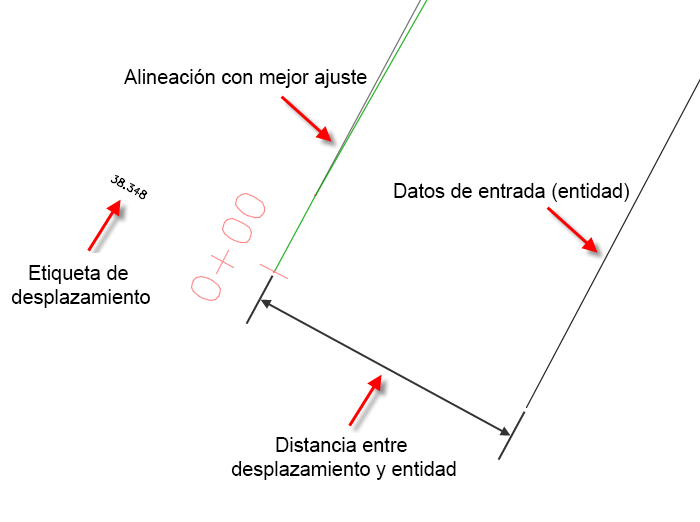 Las etiquetas muestran la distancia de desfase horizontal positiva o negativa desde la alineación de ajuste óptimo a los datos de entrada (entidades). Un valor positivo indica que los datos de entrada están a la derecha de la alineación de ajuste óptimo (cuando se inicia en el P.K. 0+00) y un valor negativo indica que los datos de entrada están a la izquierda de la alineación de ajuste óptimo.
