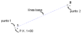 La línea base se extiende del punto 1 al 2. El punto 1 se establece como P.K. 1+00. La orientación y las distancias se expresan en las unidades actuales, a menos que se escriba un sufijo apropiado.