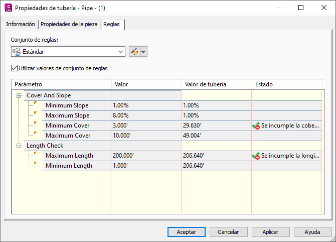 en la columna Valor de tubería porque han infringido las normas de diseño especificadas en la columna Valor. Observe el texto descriptivo de infracción de regla que se muestra en la columna Estado.
