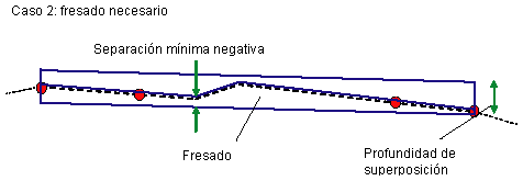 En el cálculo del área de fresado se utiliza el área entre líneas de muestreo consecutivas y los desfases izquierdo y derecho. Si la diferencia en la anchura entre los desfases es menor que el valor de tolerancia, el área no se incluyen en el informe.