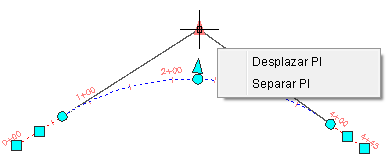 Al seleccionar un punto (1), se crea el nuevo PI (2). En el nuevo PI, se crean los puntos finales para las nuevas líneas, que mantienen la tangencia entre sí.