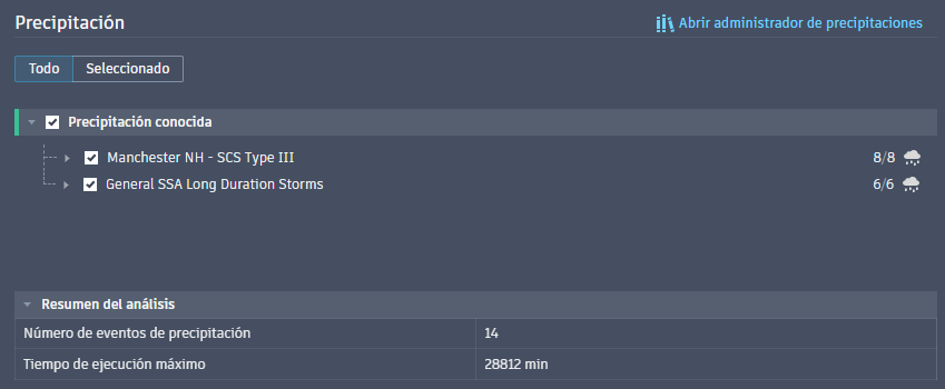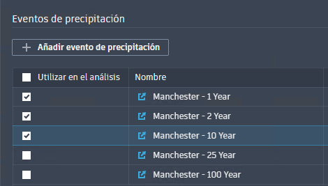 En la sección Precipitación, seleccione uno o varios conjuntos de precipitaciones para aplicar al sistema de drenaje.