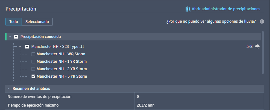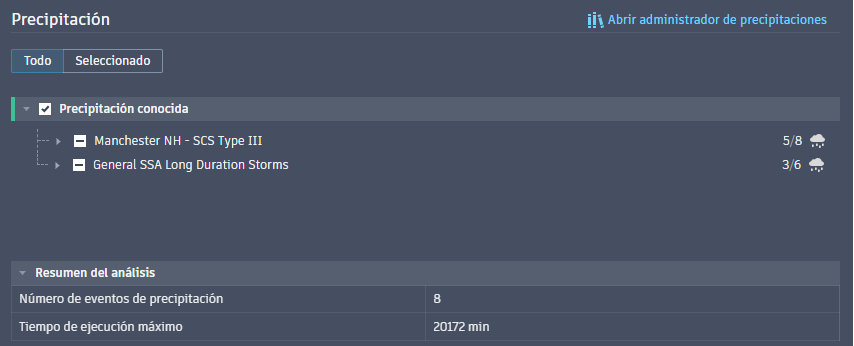 Los recuentos a la derecha de los conjuntos de precipitaciones representan el número total de eventos seleccionados del número posible de eventos del conjunto. El Resumen de análisis en la parte inferior muestra el número total de eventos de precipitación aplicados al sistema de drenaje y el mayor tiempo de tramo máximo especificado de los eventos.