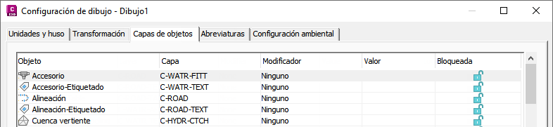 Las capas base por defecto para los objetos se especifican en la ficha Capas de objetos del cuadro de diálogo Configuración de dibujo.