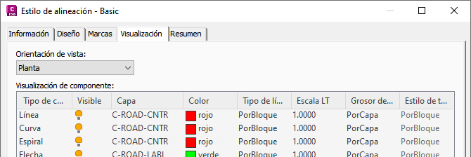 Si está acostumbrado a controlar los objetos manipulando las capas, es probable que desee establecer los distintos parámetros de visualización de componente del estilo de objeto en PorCapa. De este modo, para cambiar el color, tipo de línea, grosor de línea o estilo de trazado de un componente de objeto solo será necesario modificar la configuración de la capa utilizando el comando Capa de AutoCAD, en lugar de tener que editar cada uno de los estilos.