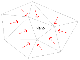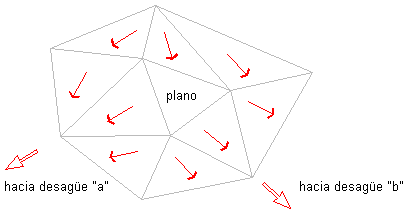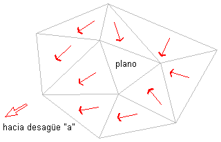 Si algunos de los triángulos no planos opuestos son descendentes desde el contorno del área plana pero fluyen hacia el mismo punto de desagüe, el área plana formará parte de la cuenca de captación para ese punto de desagüe “a”, según se muestra en la siguiente ilustración: