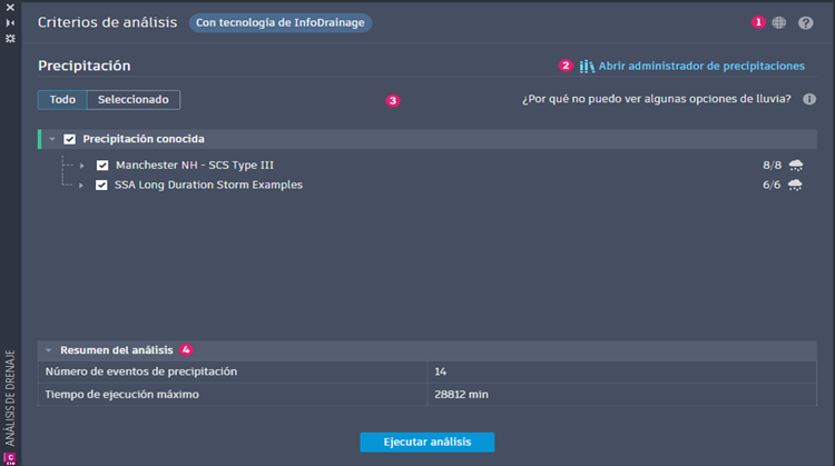 La interfaz de usuario inicial de Criterios de análisis permite especificar datos de precipitación para probar el sistema de drenaje activo. Si no se han configurado conjuntos de precipitaciones para el proyecto, solo podrá abrir el Administrador de precipitaciones desde la interfaz. Los datos de precipitación son necesarios para iniciar el proceso de análisis.