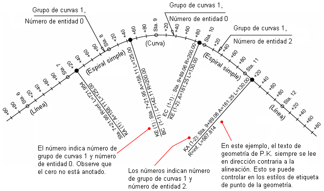 Cuando se crean alineaciones, se etiquetan automáticamente con las etiquetas especificadas en el cuadro de diálogo Etiquetas de alineación. Las etiquetas se aplican a lo largo de la alineación en los puntos especificados, por ejemplo, los P.K. principal y secundario.