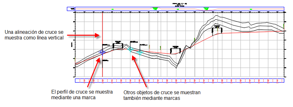 Puede añadir cruces a las visualizaciones del perfil para identificar dónde cruzan los objetos lineales al perfil con respecto a la alineación de nivel superior.