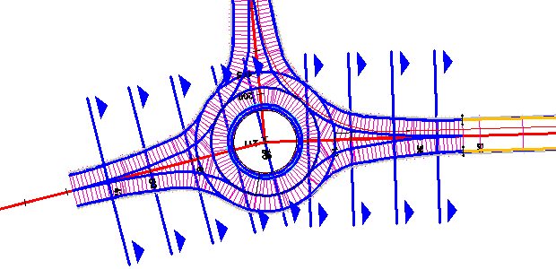 Puede realizar un muestreo de secciones transversales complejas o de varias obras lineales, como intersecciones, glorietas, calles sin salida, rampas de salida y ramales de acceso. En las imágenes siguientes, las obras lineales constan de varias líneas base. Mediante las líneas de muestreo, las secciones pueden realizar un muestreo de cualquier línea base con la que intersequen las líneas de muestreo.