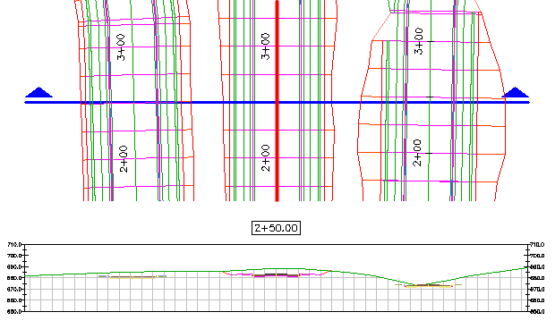 Las líneas de muestreo se generan a lo largo de una alineación de línea base de la obra lineal. Las secciones y las vistas en sección se crean para visualizar la obra lineal y el terreno circundante a una determinada anchura de franja en cualquier lado de la línea base. Las secciones también se pueden utilizar para calcular los volúmenes de material de obra lineal.