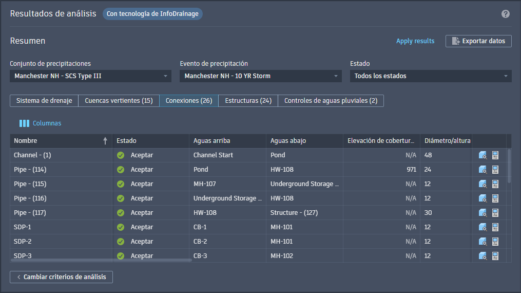 Una vez finalizado el análisis del sistema, los resultados se informan en el nivel de sistema y en forma de categorías de objeto: Caudales de entrada, Tuberías, Estructuras y Aguas pluviales.