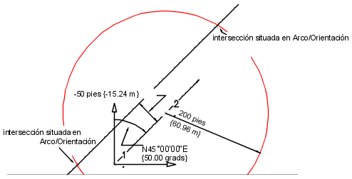 Las intersecciones se ubican entre un radio de arco de 200 con centro en el punto 2 y una orientación de 50.0000 dibujada desde el punto 1 con una distancia de desfase de 50 hacia la izquierda.