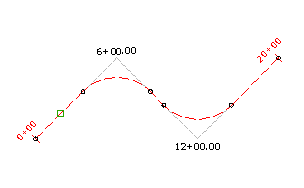 Puede añadir etiquetas de vértice en la alineación, incluidos el vértice real de dos tangentes y las ubicaciones virtuales del vértice para curvas y grupos de espiral-curva-espiral.