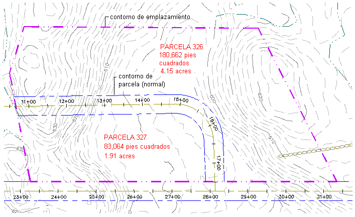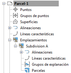 Un dibujo puede incluir varios emplazamientos, pero cada emplazamiento contiene sólo una colección de parcelas. Ninguna parcela única puede pertenecer a más de un emplazamiento. Estas relaciones se pueden ver en la colección Emplazamientos, dentro del Espacio de herramientas, en la ficha Prospector: