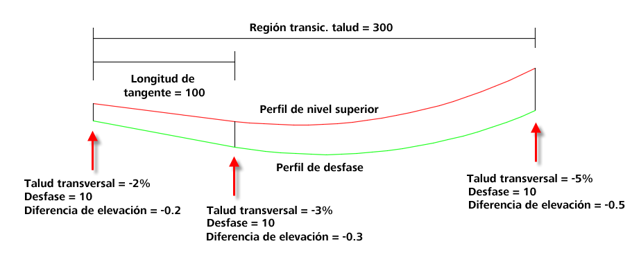 Donde hay una región de transición especificada entre un talud transversal y otro, la geometría de perfil de desfase se crea como se muestra en el ejemplo siguiente.