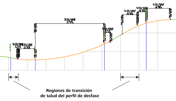 Los ejemplos siguientes muestran un perfil de eje (parte superior) y un perfil de desfase con regiones de transición de talud (parte inferior).