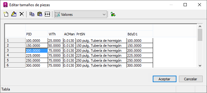 - Para modificar los valores de tamaños de tuberías, seleccione la fila y la celda de tamaño. Haga doble clic para editar.