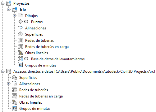 La figura muestra las colecciones para un proyecto de Vault llamado Trio y un proyecto de acceso directo a datos denominado Arc. Ambos tipos de proyecto se crean a partir de la plantilla de proyecto por defecto. Como resultado, ambos tienen colecciones idénticas de superficies, alineaciones y otros objetos a los que se puede hacer referencia en varios dibujos.