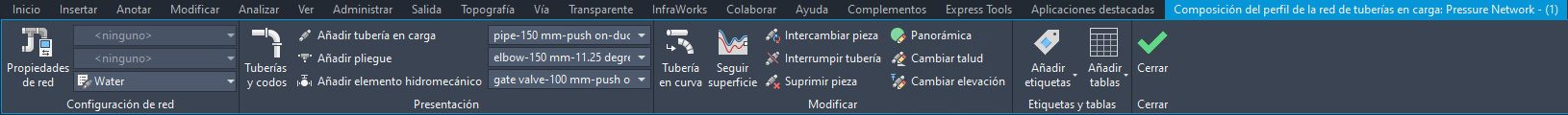 Nota: La red de tuberías en carga debe estar en visualización del perfil antes de poder acceder a la cinta de opciones Herramientas de composición de perfil.