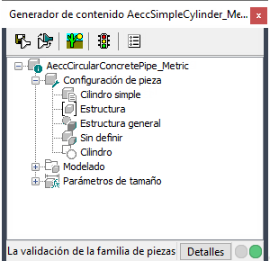 Al abrir el entorno de generación paramétrico, la carpeta superior del explorador de piezas es la carpeta Configuración de pieza. La configuración de pieza define las características y el comportamiento de la pieza en función de la categoría (tubería o estructura), el tipo y el subtipo, y es necesaria para poder guardar la pieza. Para garantizar que la pieza se pueda validar y guardar correctamente, se debe definir su configuración antes de empezar a modelarla.