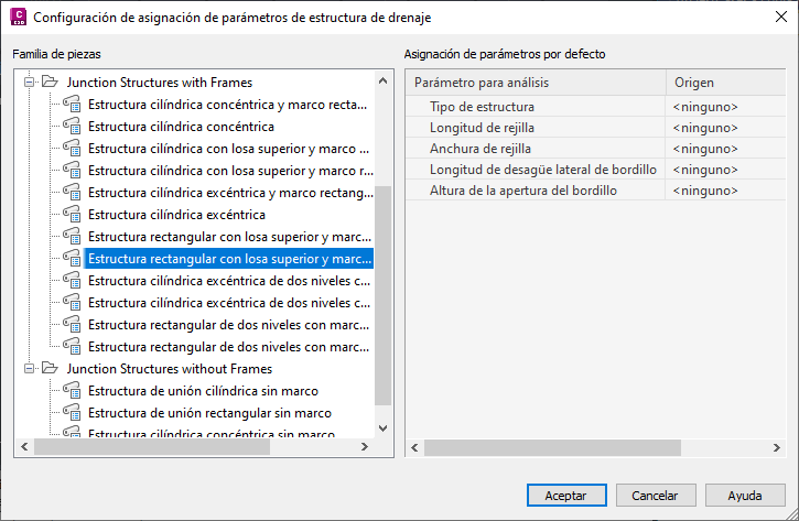Asignar parámetros de estructura de drenaje. En el cuadro de diálogo Asignar parámetros de estructura de drenaje, haga clic en Configuración de asignación.