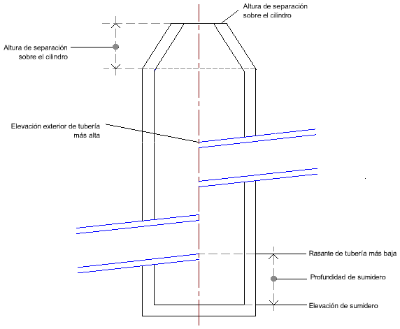 Si una tubería conectada se desplaza hacia abajo, hasta un punto por debajo de la elevación de sumidero de la estructura conectada, pero la propiedad Controlar sumidero por está definida en Elevación, el sumidero se desplazará automáticamente hacia abajo, hasta una elevación equivalente a la elevación de tubería inferior. En este caso, la profundidad de sumidero es cero.