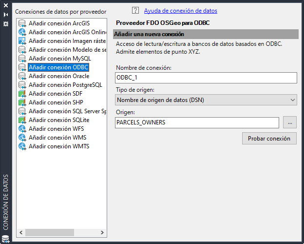 En la ventana Conexión de datos, especifique la nueva conexión. No añada al mapa ninguna capa de clase de elemento específica desde el origen ODBC. Toda la información pasa a estar disponible en Conjunto de herramientas AutoCAD Map 3D automáticamente al conectar con el origen ODBC.