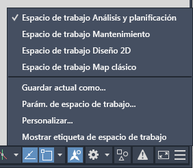 • Espacio de trabajo Mantenimiento: personalizado para quienes utilizan un modelo de sector empresarial. Cuando se abre un dibujo que utiliza este modelo, Conjunto de herramientas AutoCAD Map 3D le solicita que cambie a este espacio de trabajo.