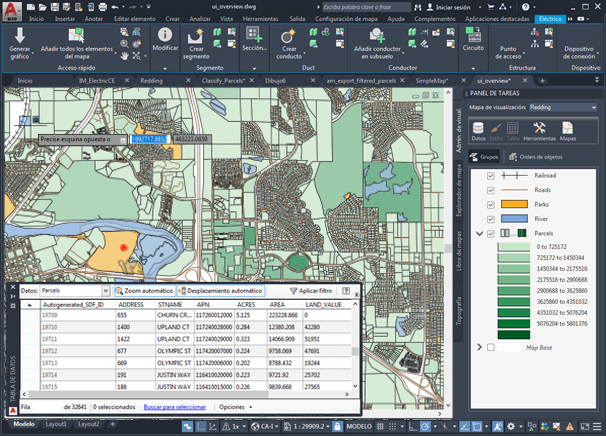 Este mapa incluye capas del Administrador de visualización para ferrocarriles, carreteras, parques, ríos y parcelas. A cada una se le ha aplicado un estilo diferente. Para obtener una introducción a las partes de la ventana de Conjunto de herramientas AutoCAD Map 3D, véase Lección 2: Conceptos básicos del Conjunto de herramientas AutoCAD Map 3D.