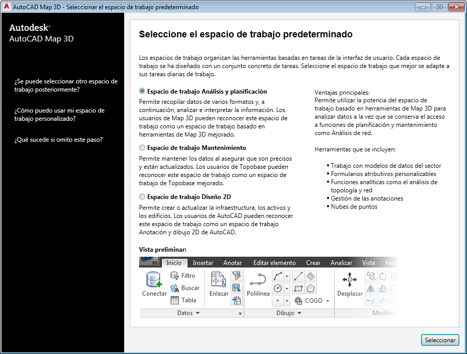 Seleccione el espacio de trabajo por defecto la primera vez que se inicie Conjunto de herramientas AutoCAD Map 3D.