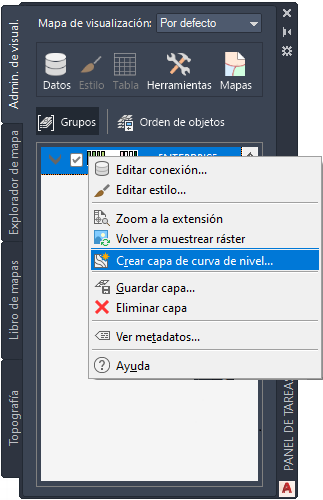 - En el Administrador de visualización, haga clic con el botón derecho en una capa de superficie y haga clic en Crear capa de curva de nivel.