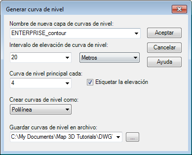 - En el cuadro de diálogo Generar curva de nivel, en la lista Intervalo de elevación de curva de nivel, seleccione 20.