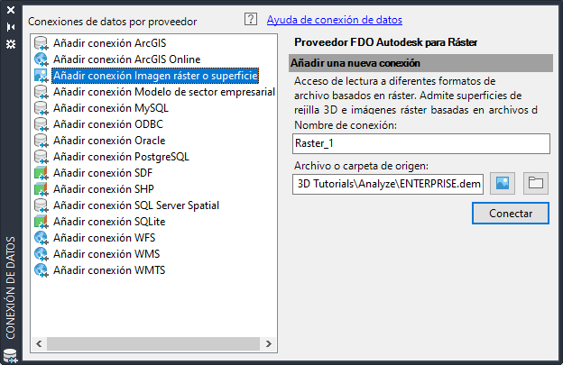 - En la ventana Conexión de datos, en Conexiones de datos por proveedor, haga clic en Añadir conexión Imagen ráster o superficie y, a continuación, en